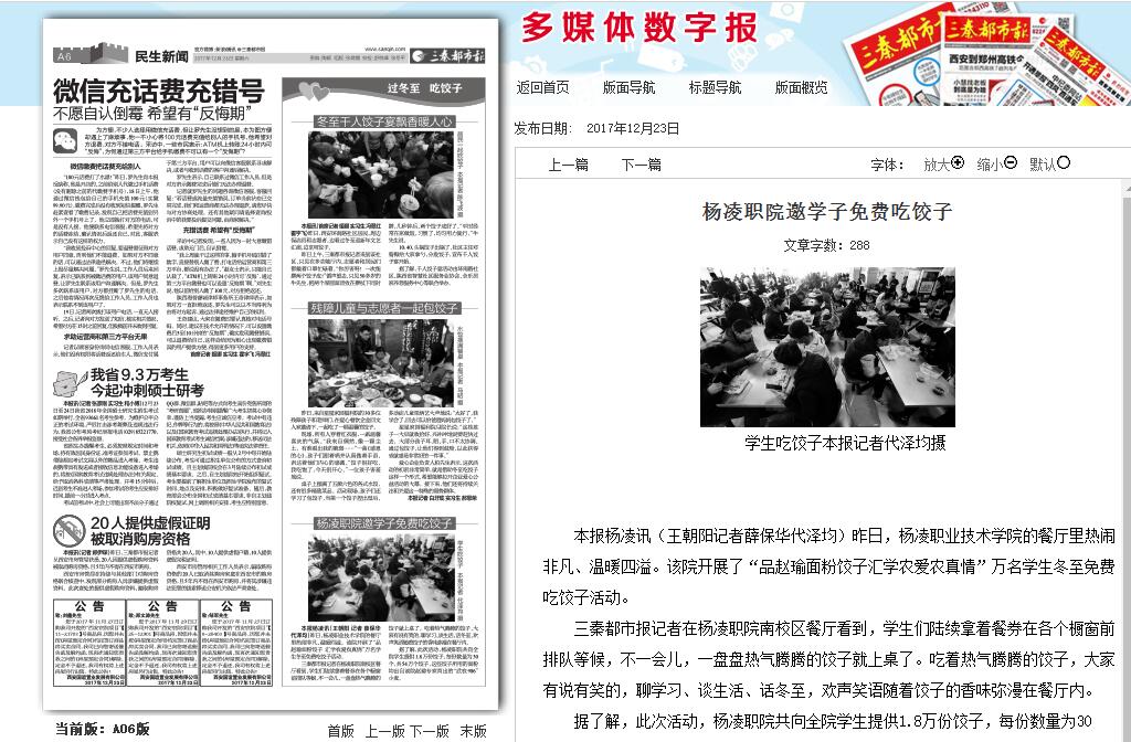 本报杨凌讯(王朝阳记者薛保华代泽均)昨日,杨凌职业技术学院的餐厅里热闹非凡、温暖四溢。该院开展了“品赵瑜面粉饺子汇学农爱农真情”万名学生冬至免费吃饺子活动。