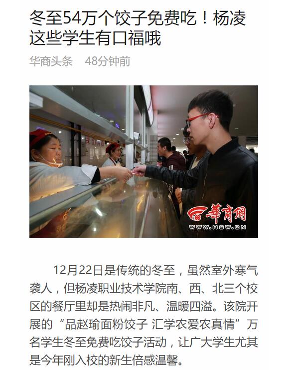 12月22日是传统的冬至,虽然室外寒气袭人,但杨凌职业技术学院南、西、北三个校区的餐厅里却是热闹非凡、温暖四溢。该院开展的“品赵瑜面粉饺子 汇学农爱农真情”万名学生冬至免费吃饺子活动,让广大学生尤其是今年刚入校的新生倍感温馨。