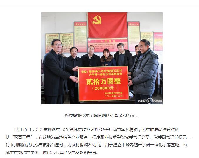 12月15日,为贯彻落实 《全省脱贫攻坚 2017冬季行动方案》精神,扎实推进高校结对帮扶“双百工程”,有效地为当地特色产业服务,杨凌职业技术学院党委书记赵曼、党委副书记任得元一行来到麟游县九成宫镇紫石崖村,为该村捐赠20万元,用于建立中蜂养殖产学研一体化示范基地、核桃丰产栽培产学研一体化示范基地及电商网络平台。