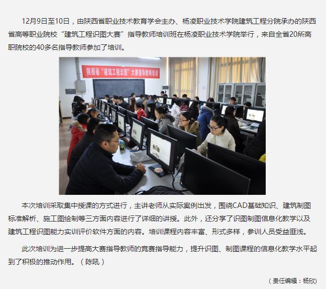 12月9日至10日,由陕西省职业技术教育学会主办、杨凌职业技术学院建筑工程分院承办的陕西省高等职业院校“建筑工程识图大赛”指导教师培训班在杨凌职业技术学院举行,来自全省20所高职院校的40多名指导教师参加了培训。
