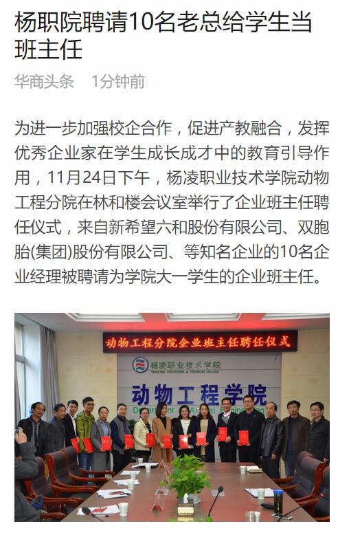 为进一步加强校企合作,促进产教融合,发挥优秀企业家在学生成长成才中的教育引导作用,11月24日下午,杨凌职业技术学院动物工程分院在林和楼会议室举行了企业班主任聘任仪式,来自新希望六和股份有限公司、双胞胎(集团)股份有限公司、等知名企业的10名企业经理被聘请为学院大一学生的企业班主任。