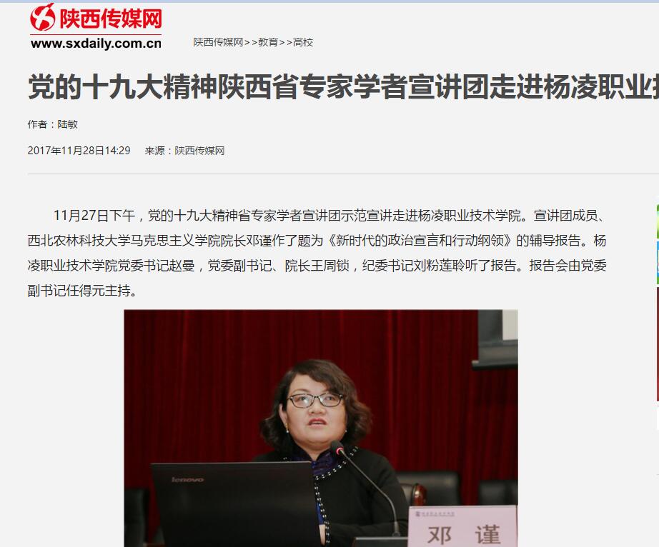 11月27日下午,党的十九大精神省专家学者宣讲团示范宣讲走进杨凌职业技术学院。宣讲团成员、西北农林科技大学马克思主义学院院长邓谨作了题为《新时代的政治宣言和行动纲领》的辅导报告。杨凌职业技术学院党委书记赵曼,党委副书记、院长王周锁,纪委书记刘粉莲聆听了报告。报告会由党委副书记任得元主持。
