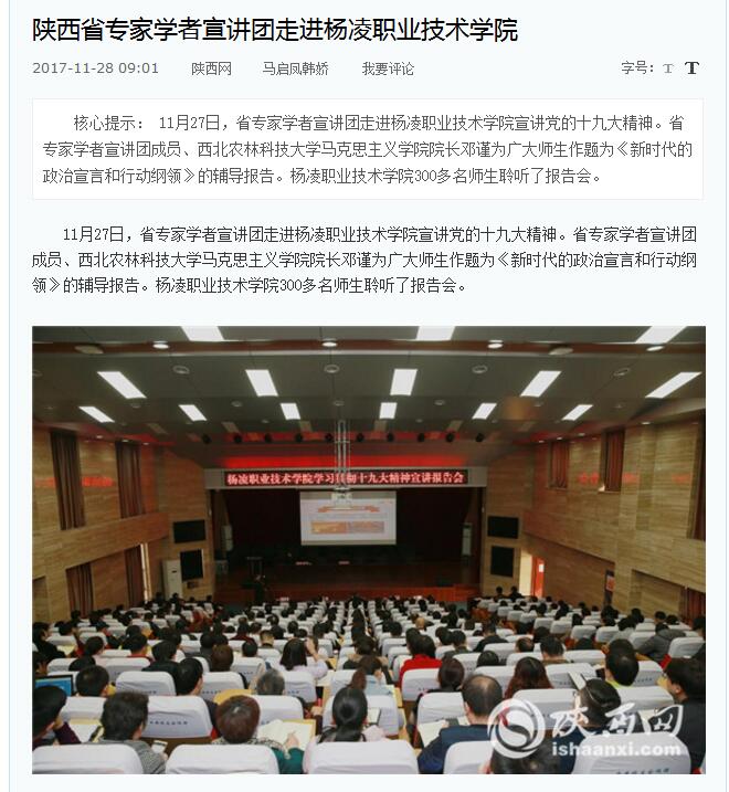 11月27日,省专家学者宣讲团走进杨凌职业技术学院宣讲党的十九大精神。省专家学者宣讲团成员、西北农林科技大学马克思主义学院院长邓谨为广大师生作题为《新时代的政治宣言和行动纲领》的辅导报告。杨凌职业技术学院300多名师生聆听了报告会。