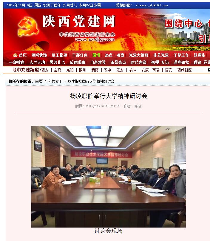 为认真贯彻落实全国、全省高校思想政治工作会议精神和省委关于“推进精神立校”的决策部署,广泛开展大学精神研讨活动,进一步凝练大学精神,不断丰富大学精神。11月10日,杨凌职业技术院举行了大学精神研讨会。该院党委书记赵曼、党委副书记任得元出席会议。研讨会由任得元主持。