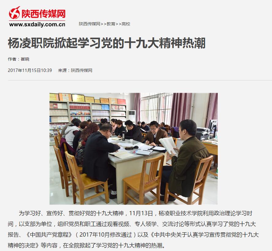 为学习好、宣传好、贯彻好党的十九大精神,11月13日,杨凌职业技术学院利用政治理论学习时间,以支部为单位,组织党员和职工通过观看视频、专人领学、交流讨论等形式认真学习了党的十九大报告、《中国共产党章程》(2017年10月修改通过)以及《中共中央关于认真学习宣传贯彻党的十九大精神的决定》等内容,在全院掀起了学习党的十九大精神的热潮。