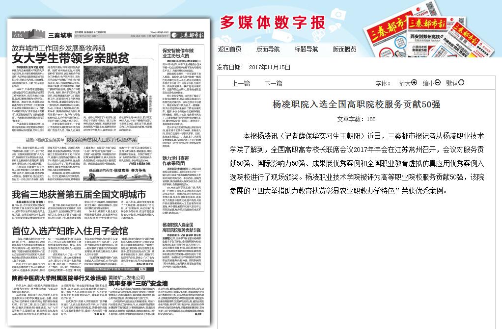本报杨凌讯(记者薛保华实习生王朝阳)近日,三秦都市报记者从杨凌职业技术学院了解到,全国高职高专校长联席会议2017年年会在江苏常州召开,会议对服务贡献50强、国际影响力50强、成果展优秀案例和全国职业教育虚拟仿真应用优秀案例入选院校进行了现场颁奖。杨凌职业技术学院被评为高等职业院校服务贡献50强,该院参展的“四大举措助力教育扶贫彰显农业职教办学特色”荣获优秀案例。