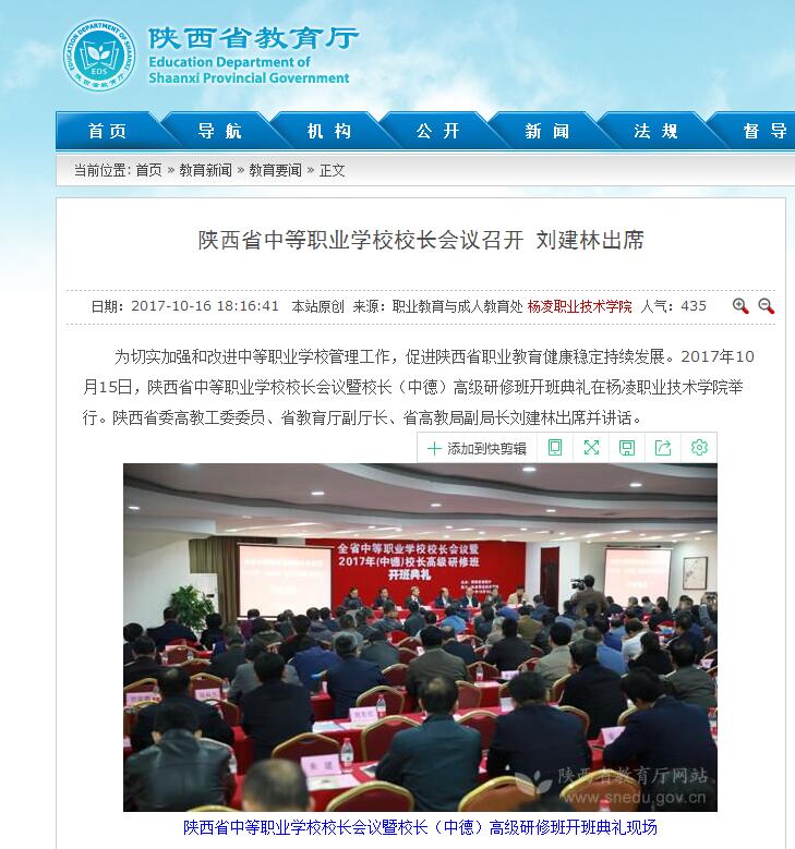 为切实加强和改进中等职业学校管理工作,促进陕西省职业教育健康稳定持续发展。2017年10月15日,陕西省中等职业学校校长会议暨校长(中德)高级研修班开班典礼在杨凌职业技术学院举行。陕西省委高教工委委员、省教育厅副厅长、省高教局副局长刘建林出席并讲话。