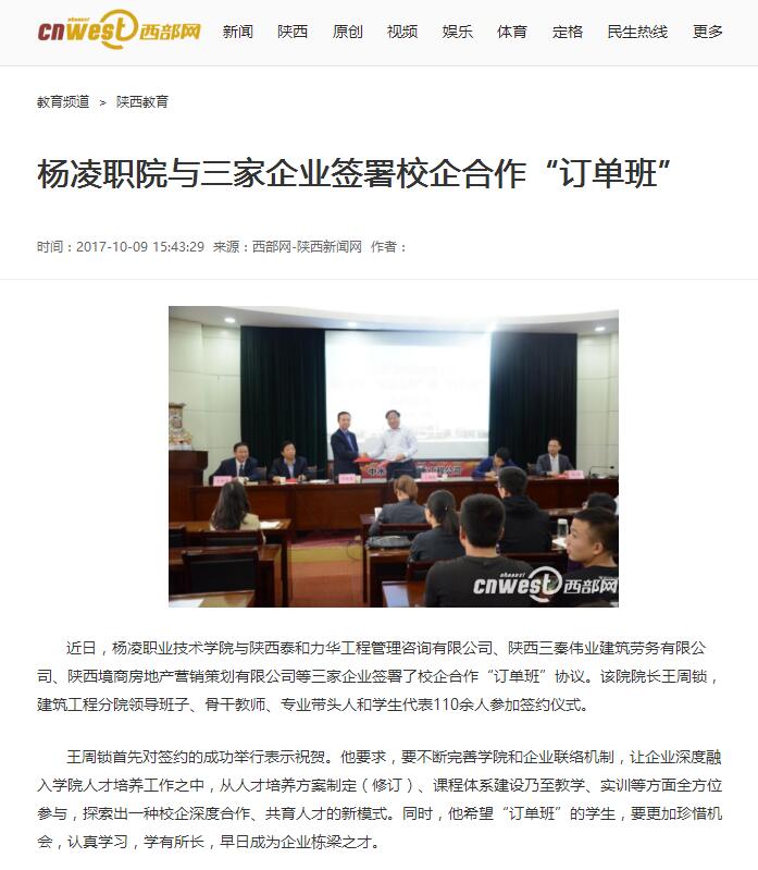 近日,杨凌职业技术学院与陕西泰和力华工程管理咨询有限公司、陕西三秦伟业建筑劳务有限公司、陕西境商房地产营销策划有限公司等三家企业签署了校企合作“订单班”协议。该院院长王周锁,建筑工程分院领导班子、骨干教师、专业带头人和学生代表110余人参加签约仪式。