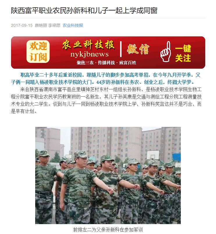 来自陕西省渭南市富平县庄里镇神芝村东村一组组长孙新科,是杨凌职业技术学院生物工程分院富平职业农民学历教育班的一名新生,其儿子孙英康是交通与测绘工程分院工程测量技术专业的大二学生。谈到与儿子一同到杨凌职业技术学院上学,孙新科笑言这并不是巧合,而是早有计划。