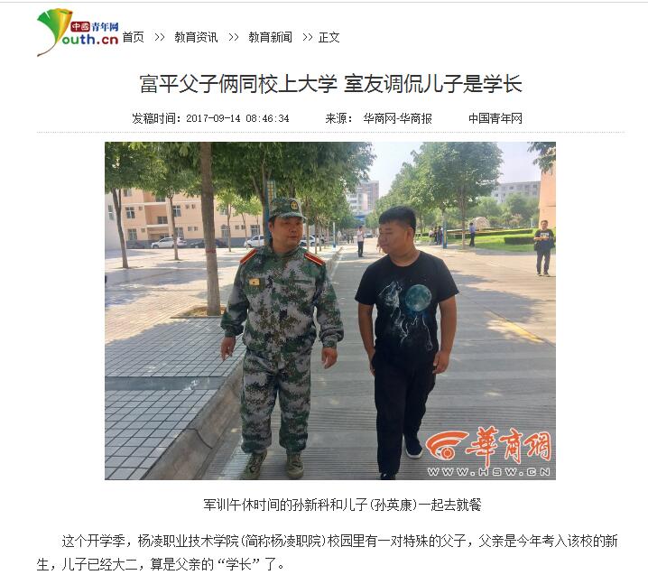 这个开学季,杨凌职业技术学院(简称杨凌职院)校园里有一对特殊的父子,父亲是今年考入该校的新生,儿子已经大二,算是父亲的“学长”了。