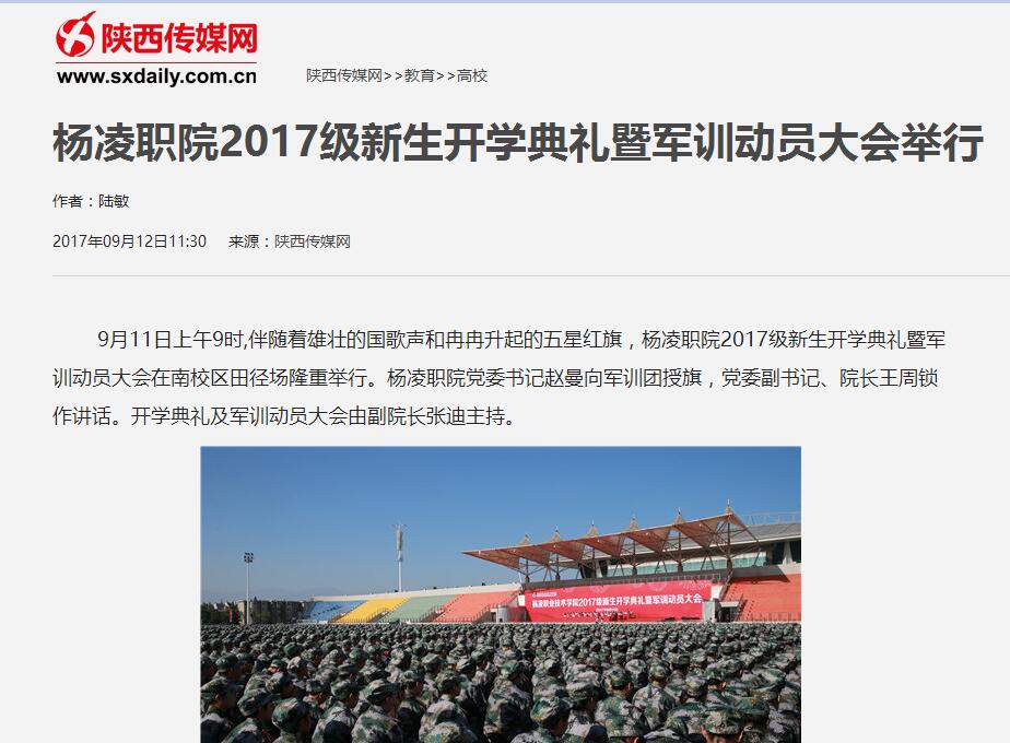 杨凌职院党委副书记任得元、副院长张永良、纪委书记刘粉莲,各分院(部)院长(主任)、党总支书记和处室负责人,各分院学工办主任、辅导员、新生班主任、2017级新生等7000余人参加开学典礼暨军训动员大会。(陆敏)