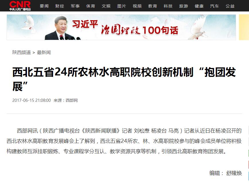 西部网讯(陕西广播电视台《陕西新闻联播》记者 刘松焘 杨凌台 马亮)记者从近日在杨凌召开的西北农林水高职教育发展峰会上了解到,西北五省24所农、林、水高职院校参与的峰会成员单位将积极构建教师互派挂职锻炼、专业课程学分互认、教学资源共享等机制,引领西北高职教育抱团发展。