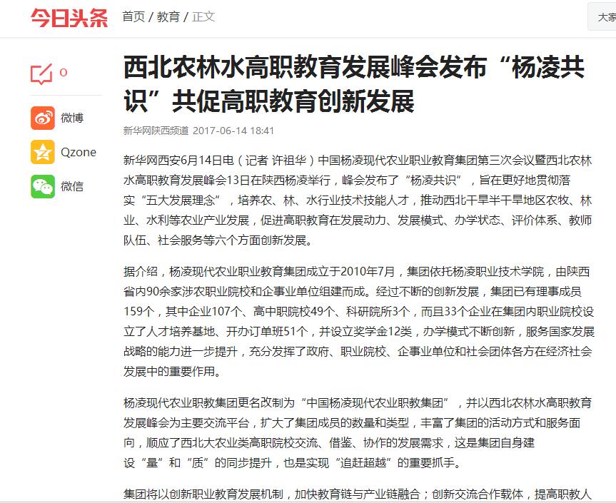 【今日头条】西北农林水高职教育发展峰会发布“杨凌共识” 共促高职教育创新发展