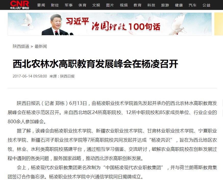 会上,杨凌现代农业职教集团更名改制为“中国杨凌现代农业职教集团”,并与荷兰朗蒂斯教育集团签订合作备忘录。杨凌职业技术学院中兴通信学院同日揭牌成立。