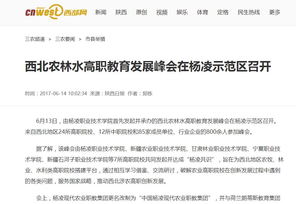 6月13日,由杨凌职业技术学院首先发起并承办的西北农林水高职教育发展峰会在杨凌示范区召开。来自西北地区24所高职院校、12所中职院校和85家成员单位、行业企业的800余人参加峰会。