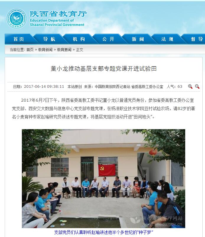 2017年6月7日下午,陕西省委高教工委书记董小龙以普通党员身份,参加省委高教工委办公室党支部、西安交大数据与信息中心党支部专题党课,在杨凌职业技术学院豆村试验农场,请82岁的著名小麦育种专家赵瑜研究员讲述专题党课,将基层党组织活动开进“田间地头”。