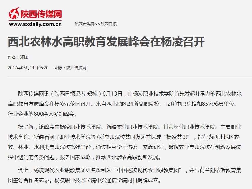 会上,杨凌现代农业职教集团更名改制为“中国杨凌现代农业职教集团”,并与荷兰朗蒂斯教育集团签订合作备忘录。杨凌职业技术学院中兴通信学院同日揭牌成立。
