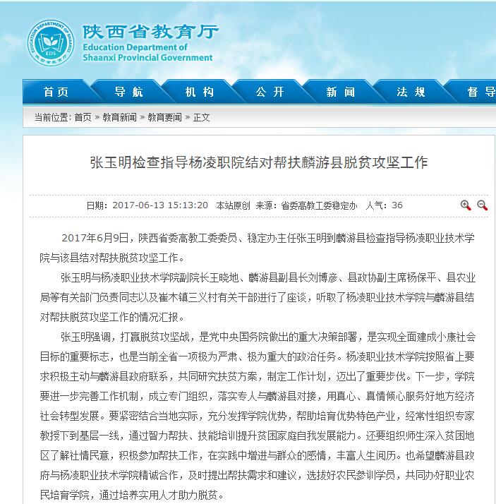 2017年6月9日,陕西省委高教工委委员、稳定办主任张玉明到麟游县检查指导杨凌职业技术学院与该县结对帮扶脱贫攻坚工作。