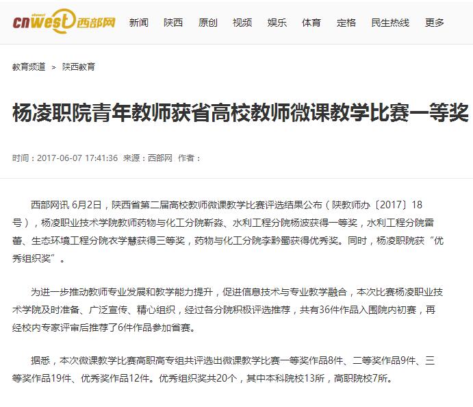 西部网讯 6月2日,陕西省第二届高校教师微课教学比赛评选结果公布(陕教师办〔2017〕18号),杨凌职业技术学院教师药物与化工分院靳淼、水利工程分院杨波获得一等奖,水利工程分院雷蕾、生态环境工程分院衣学慧获得三等奖,药物与化工分院李黔蜀获得优秀奖。同时,杨凌职院获“优秀组织奖”。