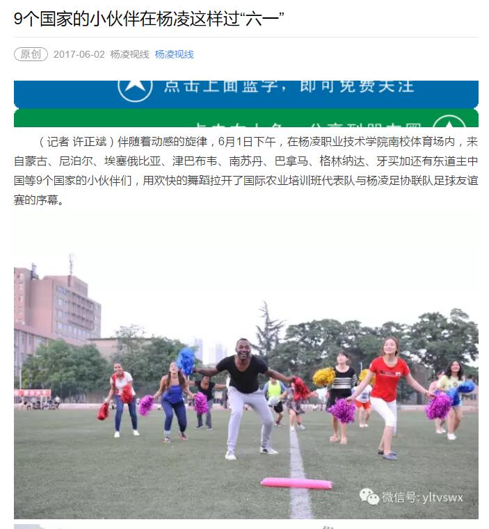 (记者 许正斌)伴随着动感的旋律,6月1日下午,在杨凌职业技术学院南校体育场内,来自蒙古、尼泊尔、埃塞俄比亚、津巴布韦、南苏丹、巴拿马、格林纳达、牙买加还有东道主中国等9个国家的小伙伴们,用欢快的舞蹈拉开了国际农业培训班代表队与杨凌足协联队足球友谊赛的序幕。