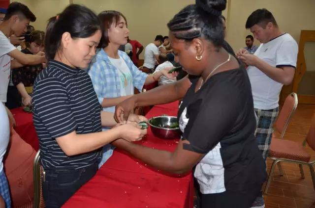 为了让前来我院参加培训学习的“一带一路”2017年发展中国家绵羊与山羊高效养殖培训班和肉牛奶牛生产综合技术培训班的56名外国朋友了解中国传统文化,欢度端午佳节。我院动物工程分院团总支组织了32名学生来到杨凌田园酒店二楼报告厅与外国友人举办了“忆端午·粽叶情,一带一路·一家亲”端午联谊活动。他们制作了图文并茂的ppt,向外国朋友讲述了中国端午节的由来和文化习俗,让外国友人感受中国传统文化的博大精深与无穷魅力。随后,32名学生分成8个小组为国际友人示范制作粽子的握粽叶、装米、放枣、裹粽叶、缠线等工艺流程,手把手的传授中国传统美食—粽子的制作技术。外国朋友们对包粽子充满了好奇,同学们耐心细致地教,外国朋友们对他们包出的生平第一个粽子,高兴地向“小师傅们”展示。来自蒙古的GANCHULUUN拿着自己亲手包的粽子说:“通过包粽子,让她知道了中国的端午节,知道了中国的伟大爱国主义诗人屈原,这是他参加的最有意义的活动之一”。为了巩固他们的制作技术,活动还设置了包粽子比赛环节,经过紧张的比赛,评选出了一、二、三等奖,在大家的欢呼声中,获奖选手上台领取了奖品—中国结。为了让国际友人品尝中国粽子的香甜,包粽子比赛结束后,同学们为每位外国朋友端上了预先准备好的粽子,蘸上蜂蜜,大家品尝着美食,纷纷竖起了大拇指。为了给外国朋友送上美好的端午祝福,同学们为每位朋友送上了美丽的香包,来自埃及的AYMAN GAMALF手捧漂亮的香包激动的说:“这是我收到的珍贵礼物,我会带回国内,好好珍藏。”