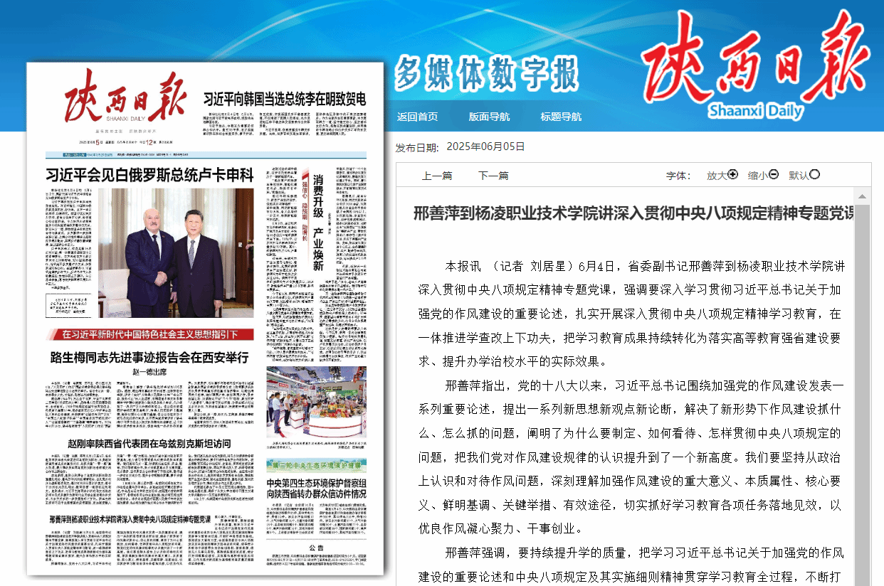 本报讯(记者 刘居星)6月4日,省委副书记邢善萍到杨凌职业技术学院讲深入贯彻中央八项规定精神专题党课,强调要深入学习贯彻习近平总书记关于加强党的作风建设的重要论述,扎实开展深入贯彻中央八项规定精神学习教育,在一体推进学查改上下功夫,把学习教育成果持续转化为落实高等教育强省建设要求、提升办学治校水平的实际效果。
