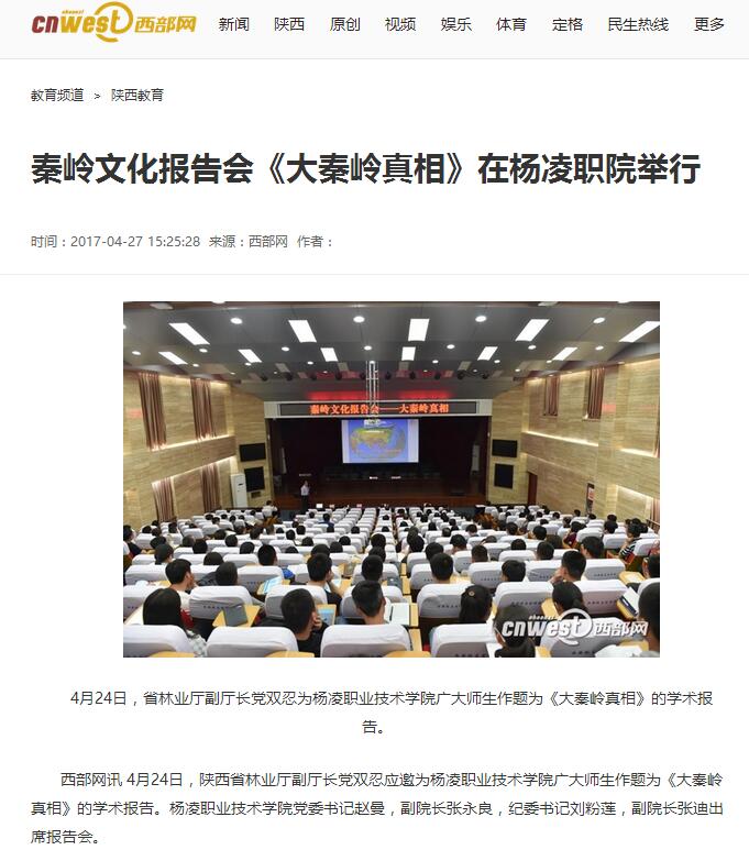 4月24日,省林业厅副厅长党双忍为杨凌职业技术学院广大师生作题为《大秦岭真相》的学术报告。
