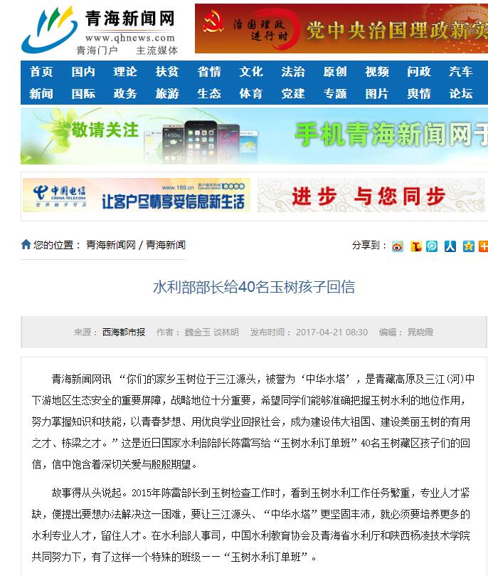 青海新闻网讯 “你们的家乡玉树位于三江源头,被誉为‘中华水塔’,是青藏高原及三江(河)中下游地区生态安全的重要屏障,战略地位十分重要,希望同学们能够准确把握玉树水利的地位作用,努力掌握知识和技能,以青春梦想、用优良学业回报社会,成为建设伟大祖国、建设美丽玉树的有用之才、栋梁之才。”这是近日国家水利部部长陈雷写给“玉树水利订单班”40名玉树藏区孩子们的回信,信中饱含着深切关爱与殷殷期望。