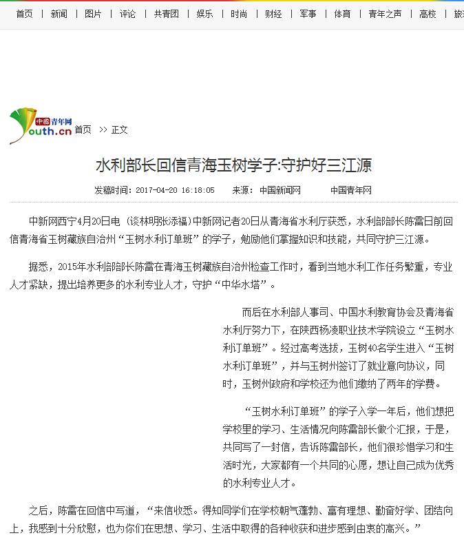 而后在水利部人事司、中国水利教育协会及青海省水利厅努力下,在陕西杨凌职业技术学院设立“玉树水利订单班”。经过高考选拔,玉树40名学生进入“玉树水利订单班”,并与玉树州签订了就业意向协议,同时,玉树州政府和学校还为他们缴纳了两年的学费。