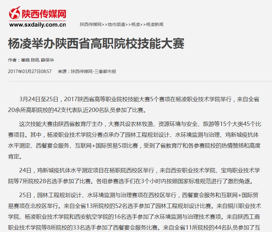 3月24日至25日,2017陕西省高等职业院校技能大赛5个赛项在杨凌职业技术学院举行,来自全省20余所高职院校的42支代表队近200名队员参加了比赛。