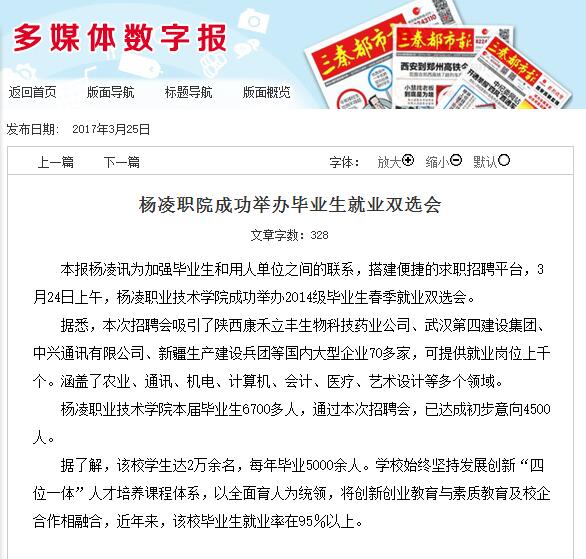 本报杨凌讯 为加强毕业生和用人单位之间的联系,搭建便捷的求职招聘平台,3月24日上午,杨凌职业技术学院成功举办2014级毕业生春季就业双选会。 据悉,本次招聘会吸引了陕西康禾立丰生物科技药业公司、武汉第四建设集团、中兴通讯有限公司、新疆生产建设兵团等国内大型企业70多家,可提供就业岗位上千个。涵盖了农业、通讯、机电、计算机、会计、医疗、艺术设计等多个领域。 杨凌职业技术学院本届毕业生6700多人,通过本次招聘会,已达成初步意向4500人。 据了解,该校学生达2万余名,每年毕业5000余人。学校始终坚持发展创新“四位一体”人才培养课程体系,以全面育人为统领,将创新创业教育与素质教育及校企合作相融合,近年来,该校毕业生就业率在95%以上。
