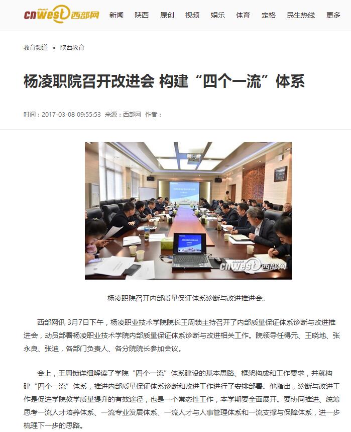 西部网讯 3月7日下午,杨凌职业技术学院院长王周锁主持召开了内部质量保证体系诊断与改进推进会,动员部署杨凌职业技术学院内部质量保证体系诊断与改进相关工作。院领导任得元、王晓地、张永良、张迪,各部门负责人、各分院院长参加会议。