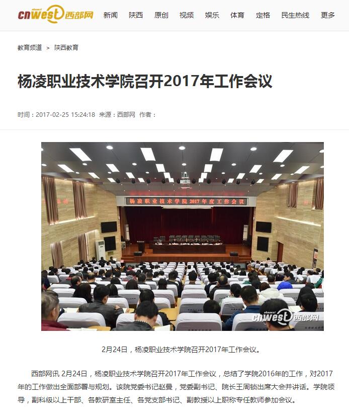 西部网讯 2月24日,杨凌职业技术学院召开2017年工作会议,总结了学院2016年的工作,对2017年的工作做出全面部署与规划。该院党委书记赵曼,党委副书记、院长王周锁出席大会并讲话。学院领导,副科级以上干部、各教研室主任、各党支部书记、副教授以上职称专任教师参加会议。