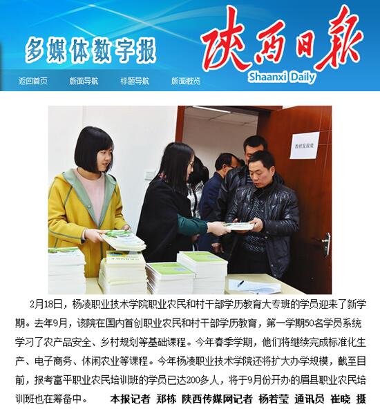 2月18日,杨凌职业技术学院职业农民和村干部学历教育大专班的学员迎来了新学期。去年9月,该院在国内首创职业农民和村干部学历教育,第一学期50名学员系统学习了农产品安全、乡村规划等基础课程。今年春季学期,他们将继续完成标准化生产、电子商务、休闲农业等课程。今年杨凌职业技术学院还将扩大办学规模,截至目前,报考富平职业农民培训班的学员已达200多人,将于9月份开办的眉县职业农民培训班也在筹备中。