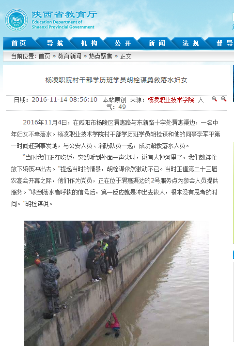 【陕西省教育厅】杨凌职院村干部学历班学员胡栓谋勇救落水妇女