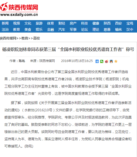 【陕西传媒网】杨凌职院刘林章同志获第三届“全国水利职业院校优秀德育工作者”称号