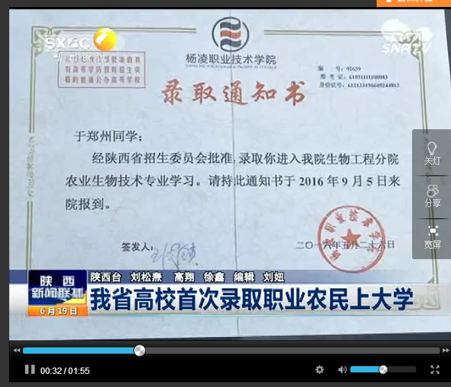 【陕西网络广播电视台】我省高校首次录取职业农民上大学