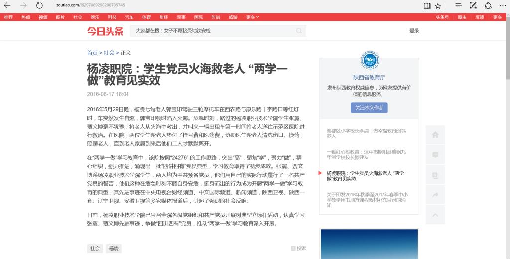 2016年5月29日晚,杨凌七旬老人郭宝印驾驶三轮摩托车在西农路与康乐路十字路口等红灯时,车突然发生自燃,郭宝印顿时陷入火海。危急时刻,路过的杨凌职业技术学院学生张翼、贾文博毫不犹豫,将老人从火海中救出,并叫来一辆出租车第一时间将老人送往示范区医院进行救治。在医院,两位学生帮老人垫付了挂号费和医药费,协助医生帮老人清洗伤口、换药,照顾老人,直到老人家属到来后他们二人才默默离开。在“两学一做”学习教育中,该院按照“24276” 的工作思路,突出“高”,聚焦“学”,聚力“做”,精心组织,强力推进,涌现出一批“四讲四有”党员典型,学习教育取得了初步成效。张翼、贾文博系杨凌职业技术学院学生,两人均为中共预备党员,他们用自己的实际行动履行了一名共产党员的誓言,他们这种在危急时刻不顾自身安危,挺身而出的行为成为开展“两学一做”学习教育的典型,其先进事迹在中央电视台财经频道、中文国际频道、新闻频道,陕西卫视、陕西一套、辽宁卫视、安徽卫视等多家媒体报道后,引起了强烈的社会反响。日前,杨凌职业技术学院已号召全院各级党组织和共产党员开展树典型立标杆活动,认真学习张翼、贾文博先进事迹,争做“四讲四有”党员,推动“两学一做”学习教育深入开展。