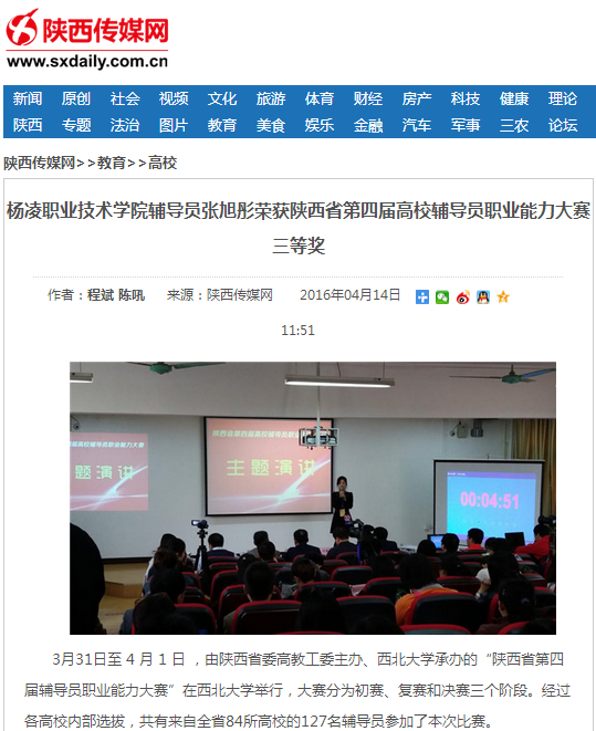 杨凌职业技术学院辅导员张旭彤积极参赛,沉着应对,通过基础知识测试和博文写作、主题班会、案例分析、主题演讲、谈心谈话等5个环节的激烈角逐,张旭彤以扎实的理论修养、优秀的职业能力、良好的心理素质,优异的临场表现充分展现了杨凌职业技术学院辅导员队伍良好的职业能力素质和精神面貌,最终荣获大赛三等奖。