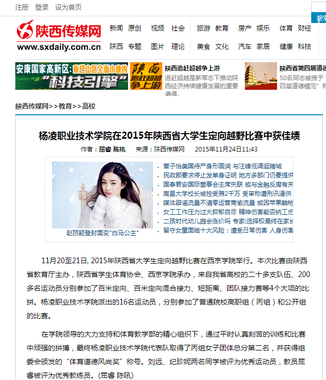11月20至21日, 2015年陕西省大学生定向越野比赛在西京学院举行。本次比赛由陕西省教育厅主办,陕西省学生体育协会、西京学院承办,来自我省高校的二十多支队伍、200多名运动员分别参加了百米定向、百米定向混合接力、短距离、团队接力赛等4个大项的比拼。杨凌职业技术学院派出的16名运动员,分别参加了普通院校高职组(丙组)和公开组的比赛。