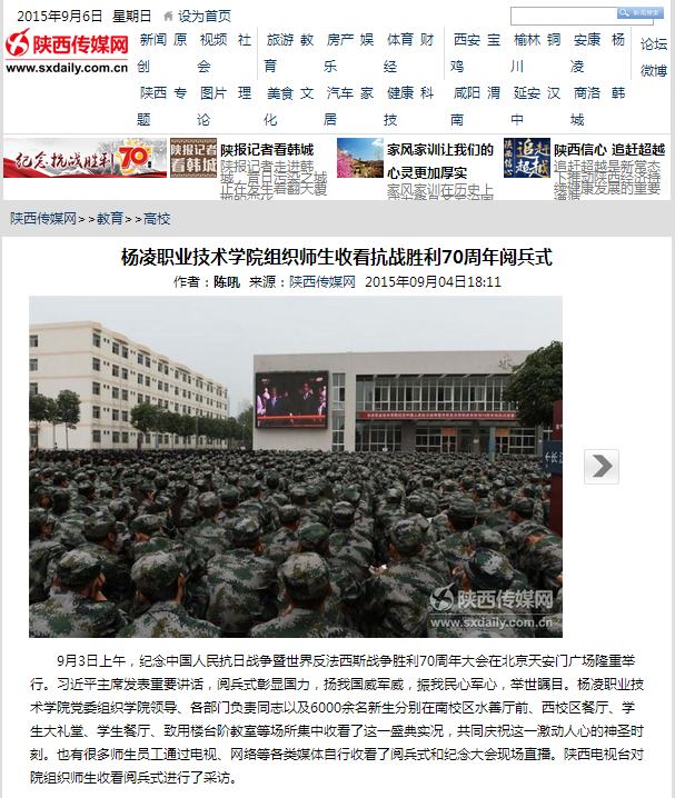 通过开展集中收看纪念中国人民抗日战争暨世界反法西斯战争胜利70周年庆典暨阅兵式直播活动,不仅表达了师生对抗战英雄的崇敬,弘扬了伟大的抗战精神,教育师生铭记历史、缅怀先烈、珍爱和平、开创未来,更进一步展现了杨凌职业技术学院师生时刻关心国家发展,戮力同心为实现“两个一百年”奋斗目标和中华民族伟大复兴的中国梦而努力奋斗的决心和信心。(陈吼)
