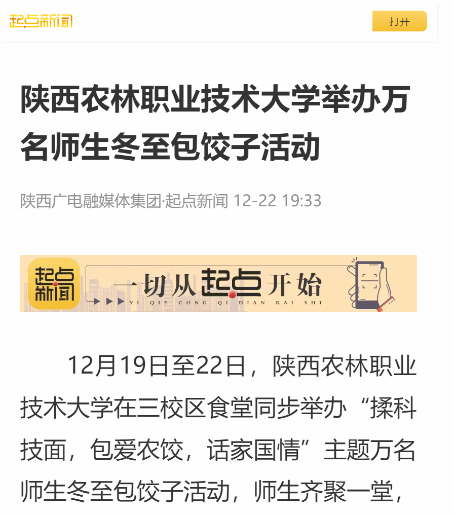 陕西农林职业技术大学万名师生冬至包饺子活动从2017年至今,已经持续开展了8年,成为了学校的一项传统特色活动。这项活动不仅为师生们提供了一个欢聚一堂、共度佳节的温馨平台,更在潜移默化中传承和弘扬了中华优秀传统文化,让“学农爱农、强农报国”的信念深深根植于学子心田。(起点新闻记者:李伟)