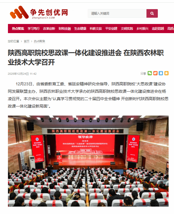 12月23日,由省委教育工委、省延安精神研究会指导,陕西高职院校“大思政课”建设协同发展联盟主办,陕西农林职业技术大学承办的陕西高职院校思政课一体化建设推进会在杨凌召开。本次会议主题为“认真学习贯彻党的二十届四中全会精神 开创新时代陕西高职院校思政课一体化建设新局面”。