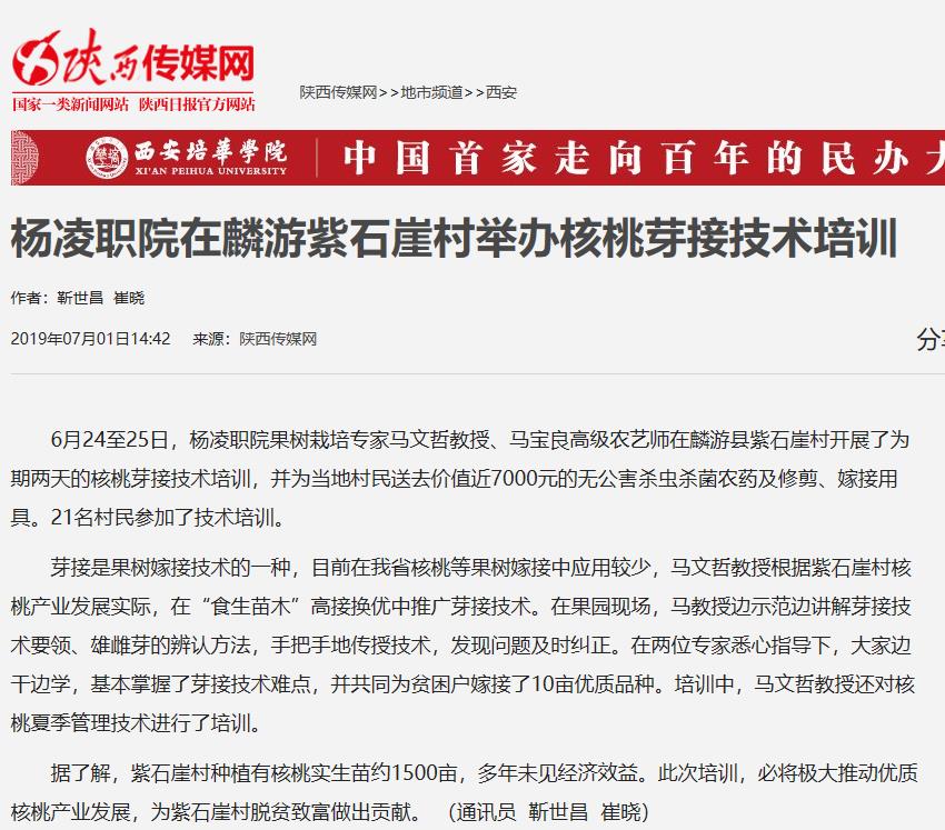 6月24至25日,杨凌职院果树栽培专家马文哲教授、马宝良高级农艺师在麟游县紫石崖村开展了为期两天的核桃芽接技术培训,并为当地村民送去价值近7000元的无公害杀虫杀菌农药及修剪、嫁接用具。21名村民参加了技术培训。