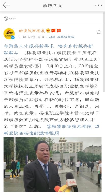 #聚焦人才振兴新需求 培育乡村振兴新动能# 【杨凌职业技术学院院长王周锁在2019级全省村干部学历教育班开学典礼上对新学员殷切寄语】 9月10日上午,2019级全省村干部学历教育班开学典礼在杨凌职业技术学院隆重举行。开学典礼上,杨凌职业技术学院院长王周锁代表杨凌职业技术学院2万余名师生表示热烈欢迎,希望新入学的村干部学员们能够站在新的时代高点,面向新的人生征程,再学习、再提升、再锻造。同时,他也表示:杨凌职业学院有信心把村干部学历教育打造成陕西地方精英管理人才的“黄埔”品牌。 @杨凌职业技术学院