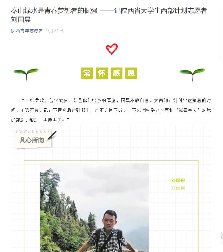 三年时间,收获满满,在工作岗位上经历磨砺,让刘国晨摆脱稚气,走向成熟。大山的魅力不言而喻,西部的魅力不言而喻。英国登山家乔治.马洛里曾经说过这样一句名言---因为山就在那里。参加大学生志愿服务西部计划,不仅仅是身份的变化,更是价值观的提升。“因为我觉得:现在,青春是用来奋斗的;将来,青春是用来回忆的。愿我们每个人都有大好的前程可奔赴,亦有难忘的岁月可回首。”