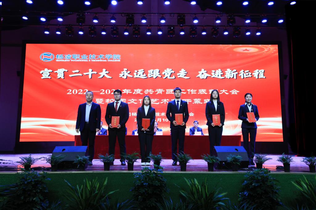 大会分为表彰大会、文艺汇演两个阶段。在表彰大会上,张朝晖宣读了《共青团杨凌职业技术学院委员会关于表彰2022-2023学年度先进集体及先进个人的决定》,学校领导为五四红旗团委、五四红旗团支部、优秀共青团干部、优秀共青团员等先进集体和个人颁奖。35名新发展团员代表进行了入团宣誓仪式。