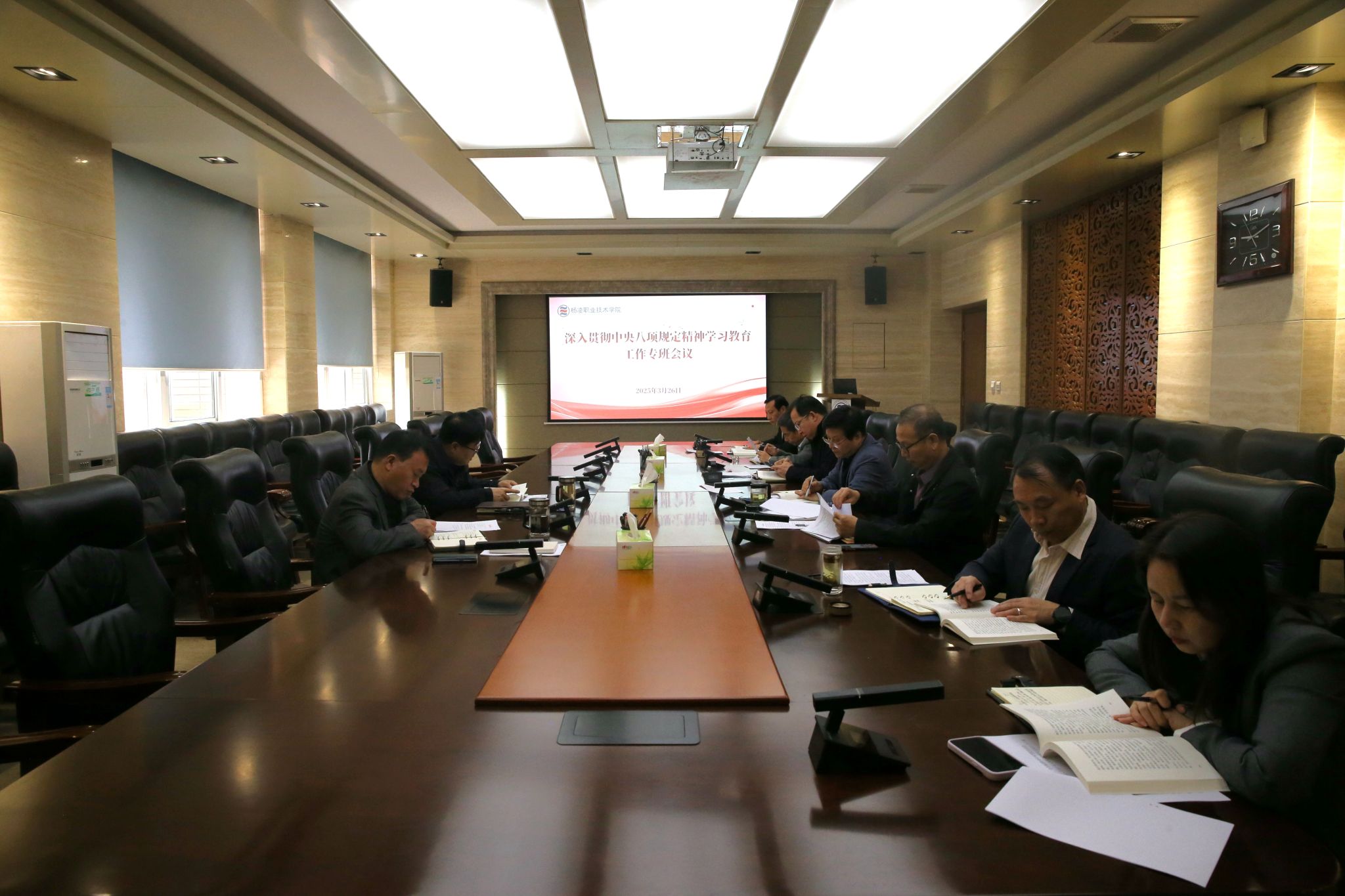 3月26日上午,学校深入贯彻中央八项规定精神学习教育工作专班召开会议,学习《习近平总书记关于党的建设的重要思想概论》、中央八项规定及其实施细则,明确专班职责任务。党委副书记刘瑞明,党委副书记、纪委书记王勇胜出席会议。